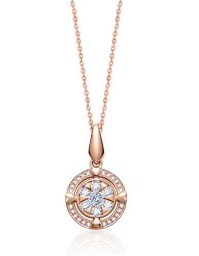 創(chuàng)意理念:吊墜取群星環(huán)繞之意,采用群鑲工藝,環(huán)繞的鉆石襯托四顆心形組成別致的花瓣羅盤造型。四顆心形分別代表幸運(yùn)、健康、愛情和財(cái)富,這是獨(dú)具魅力的幸運(yùn)符號(hào),帶上它,讓好運(yùn)在頸間蔓延。