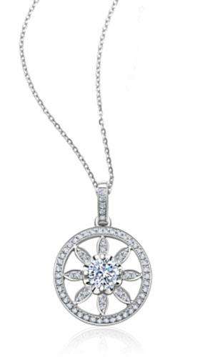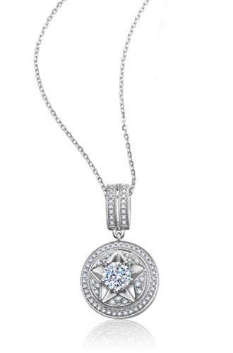 創(chuàng)意理念:五角星襯托明亮式切割的主鉆,散發(fā)獨(dú)特光芒。精密鑲嵌的圓環(huán),如同一道幸福的光環(huán),代表幸福女性堅(jiān)定的內(nèi)心與溫和的外在。五角星造型不但使吊墜整體立體飽滿,更增加了光的折射面,突顯鉆石光彩。