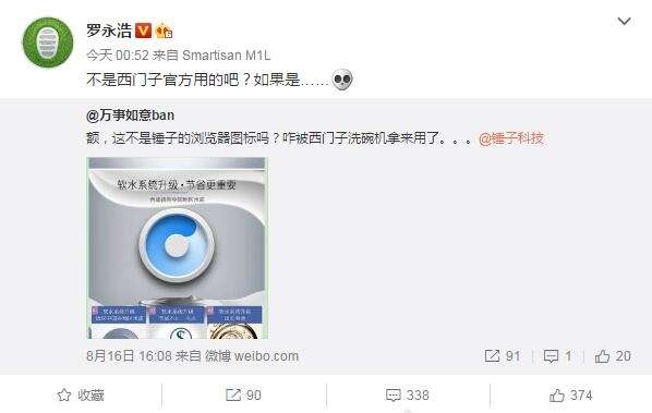 網(wǎng)友@萬事如意ban 發(fā)微博稱,“額,這不是錘子的瀏覽器圖標嗎?咋被西門子洗碗機拿來用了。。。”