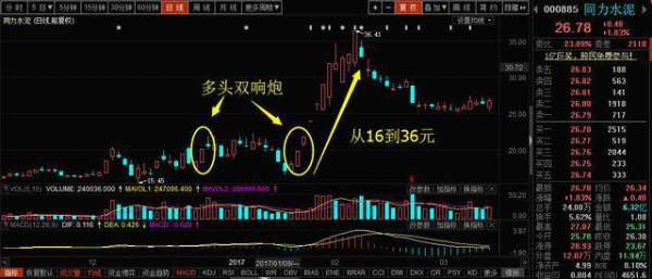 同力水泥是1月份做的一只實盤票,主力深度介入股并且底部較長時間的強勢震倉洗盤,多頭雙響炮就是啟動信號,在低位果斷殺入,雖然沒有從19拿到36,但是收益也頗豐,我們回顧一下同力水泥這個多頭雙響炮股的技術走勢: