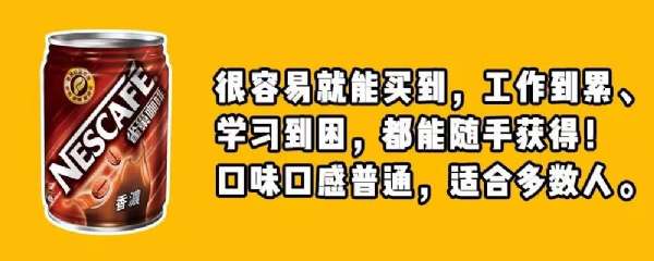 關(guān)鍵詞:容易買到、好入口 適合人群:非咖啡愛好者、對(duì)于咖啡口味沒有特別要求的人