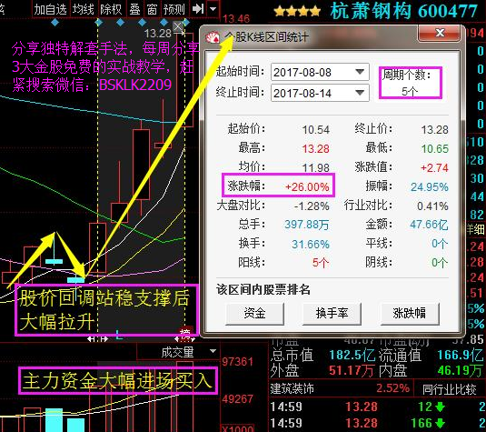 杭蕭鋼構(gòu)(600477),該股是筆者用波段趨勢法分享的其中一只股票,截止?jié)q幅已經(jīng)26%了。相信這樣的收益對不少的人來說,都是非常不錯的了。而這種股票選起來也并不難,只要會看趨勢,會跟莊操作。沒把握住這波漲幅的朋友們也不要氣餒,后期我還會繼續(xù)給大家分享講解波段趨勢法的選股思路,只要你用心關(guān)注筆者,那肯定不會錯過!