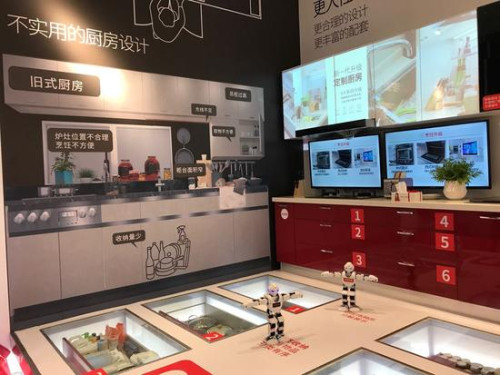??尚品宅配的VR HOME獨占一隅,專門設(shè)立了VR展臺與觀眾互動。在展位門口,尚品宅配還引來了機(jī)器人站臺,將不實用的廚房設(shè)計與更人性的定制廚房進(jìn)行對比,通過柜體分解展示了有序的收納空間,將怎樣是更合理的設(shè)計、更豐富的配套真實的呈現(xiàn)出來。