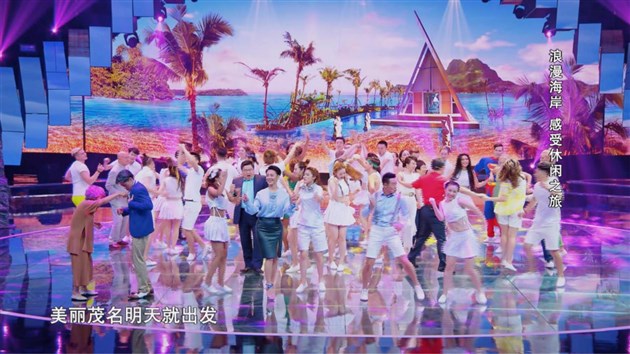 最后的城市名片環(huán)節(jié),十堰市上演了一場史詩大秀,表演展現(xiàn)了從恐龍誕生到高科技汽車制造的歷史發(fā)展進程。而茂名的城市名片則是在一場熱鬧喜慶的“婚禮秀”中展開,把整個演播廳變成一個載歌載舞的歡樂大舞臺。
