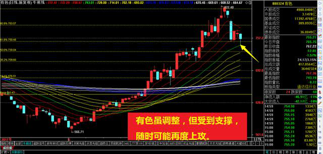 有色板塊在受到750點(diǎn)的支撐后連續(xù)兩天企穩(wěn),正常應(yīng)該就會去攻擊前期的高點(diǎn)了。今天卻出現(xiàn)了調(diào)整,但是最終受到了平地高樓61.8%線以及牛熊線綠色線的支撐,站穩(wěn)在了750點(diǎn)之上。只要接下來收陽向上,則上攻還有希望。另外,有色現(xiàn)在是單邊上漲——單邊下跌,即便是頂部,理論上還會有一次反彈的機(jī)會。到了反彈不創(chuàng)新高的時(shí)候,那是最后的出局機(jī)會,現(xiàn)在還是相對有希望的。