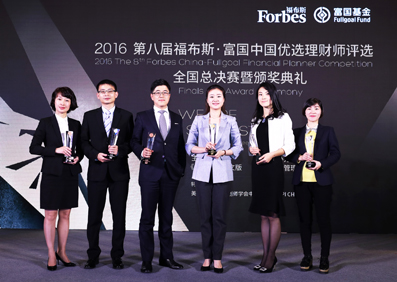 易梅(右一)在“2016第八屆福布斯?富國中國優選理財師”大賽頒獎現場