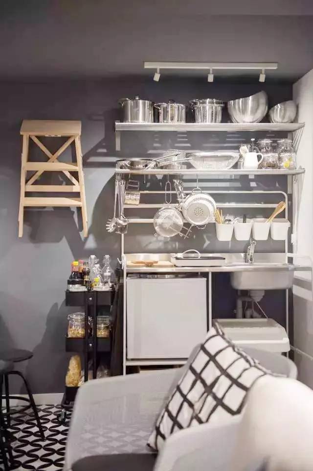 年輕人大多較少使用廚房,于是客廳中設置了較小的僅供基礎加熱的廚房設備。