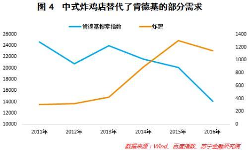 下圖顯示了肯德基搜索指數(shù)和炸雞搜索指數(shù)的走勢,可以發(fā)現(xiàn)2014年和2015年炸雞搜索量暴增,與此對應(yīng)的是肯德基搜索量持續(xù)下滑: