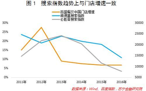 下圖1顯示了百盛餐飲中國門店增速與肯德基和必勝客搜索指數(shù)的走勢,它們的趨勢上是比較一致的: