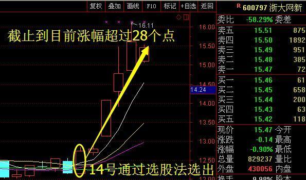 當(dāng)然這種上升回檔走勢(shì)的股票還是有不少的,就像本人在14號(hào)通過(guò)選股法選出并及時(shí)講解的浙大網(wǎng)新(600797),其實(shí)當(dāng)時(shí)看到講解的朋友也是不少,今天也是再次給講解一下