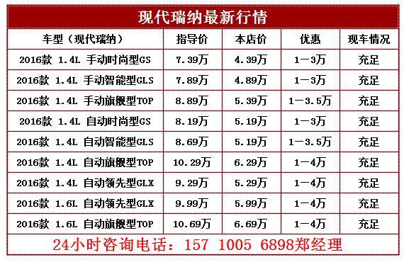 活動(dòng)期間購(gòu)車成功可獲得價(jià)值18888的超值禮包(3M貼膜、車載冰消.大包圍腳墊、坐墊,發(fā)動(dòng)機(jī)護(hù)板、DVD導(dǎo)航、倒車影像、車身封釉、底盤封塑、香水、麂皮、后倉(cāng)墊任選)當(dāng)天購(gòu)車提供所有手續(xù)(購(gòu)車發(fā)票、出廠合格證、一次性證書、保養(yǎng)手冊(cè)、納稅申報(bào)表、首保卡)。當(dāng)天辦理臨時(shí)牌照(節(jié)假日不休)本店考慮到外地客戶來(lái)京購(gòu)車路途遙遠(yuǎn),可報(bào)銷來(lái)京單程路費(fèi)【火車票、高鐵票、飛機(jī)票(限兩人票據(jù))】歡迎到店試乘試駕、蒞臨鑒賞!2017款現(xiàn)代瑞納價(jià)格Tel:15710056898鄭經(jīng)理