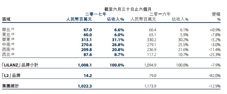 根據(jù)公告顯示,華東與中南地區(qū)仍然是LILANZ品牌的收入貢獻(xiàn)最大區(qū)域,合共占LILANZ總收入57.9%(2016年上半年:55.7%),店舖數(shù)量占比50.5%(2016年上半年:50.0%)。除此之外,其他地區(qū)除了華北地區(qū)錄得輕微增長(zhǎng)外,各區(qū)的銷(xiāo)售都有所減少。西北地區(qū)銷(xiāo)售倒退較多,達(dá)25.3%,主要由于陜西和新疆受2016年春夏季的渠道庫(kù)存問(wèn)題影響較深。但此乃短暫的影響,而西北地區(qū)的銷(xiāo)售亦已于2017年秋季回復(fù)升軌。西南地區(qū)亦錄得雙位數(shù)的銷(xiāo)售下跌,主要受重慶地區(qū)銷(xiāo)售下跌影響。華北地區(qū)錄得增長(zhǎng),主要是內(nèi)蒙古于去年上半年更換了分銷(xiāo)商后銷(xiāo)售大幅增長(zhǎng),抵銷(xiāo)了山西銷(xiāo)售的下跌。