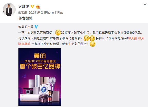 說這句話的背景是,在激烈鏖戰的家電行業中,美的獲得了比同行更多的光芒,第二次上榜《財富》榜單,市值站在2800億元。從2008年初試水電商,到2014年開設天貓官方旗艦店,再到2017年用時7個月在天貓上實線銷售額突破100億,美的電商成績發展迅猛。