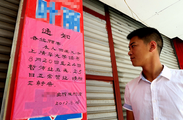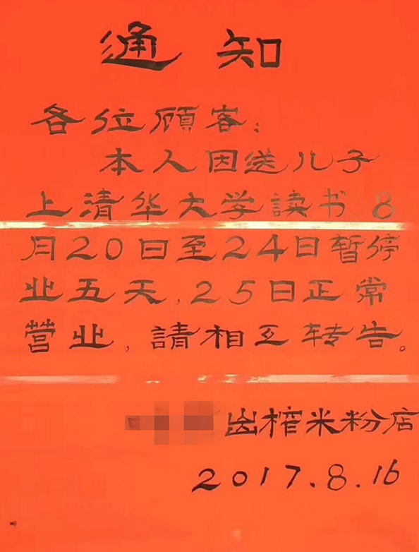 米粉店的老板名叫唐德晉,目前已到了北京。他說(shuō),歇業(yè)通知是他本人所寫的,“兒子考上清華大學(xué),我們的親戚朋友都很高興,生意可晚點(diǎn)做,但我們還是想送孩子一起去北京,并且于23日一起去學(xué)校報(bào)名。”