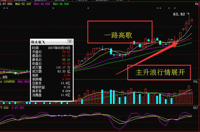 我們從上圖中可以看出,科大訊飛早在6月20日之前都沒有一個(gè)好的表現(xiàn),前期成交量低迷,均線上不能看出主力發(fā)力的跡象,從30日線上來看,前途渺茫,所以對(duì)于當(dāng)時(shí)的走勢(shì),我解股認(rèn)為很多人都不會(huì)看好的,但到了6月20日之后,市場(chǎng)發(fā)生了改變,我們從當(dāng)時(shí)的成交量上看,主力已經(jīng)完成了前面的一波低吸動(dòng)作,隨后展開了拉升,進(jìn)入主升浪行情,這個(gè)階段往往更多的投資者處于一個(gè)觀望的階段,這是很多人的一種操作習(xí)慣,即使我們當(dāng)時(shí)看到MACD和KDJ金叉的時(shí)候,也還是不敢去進(jìn)場(chǎng)的,這就是傳統(tǒng)的思路決定了自己的口袋財(cái)富大部分都是負(fù)值的,現(xiàn)在漲幅已經(jīng)很高,如果我們把6月20日后的那一波定義為第一波行情的時(shí)候,現(xiàn)在的行情就是一個(gè)魚尾行情了,也是一個(gè)瘋狂的行情,大部分人都跟不上,嘆息錯(cuò)過了之前的機(jī)會(huì),但這個(gè)階段買進(jìn)去往往面臨的風(fēng)險(xiǎn)很大。