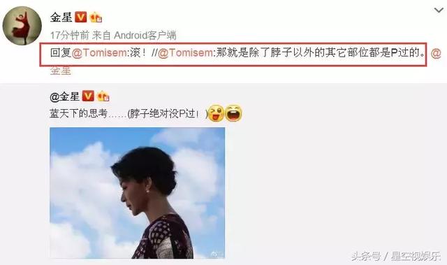 金星都如此說明了,卻還有一個腦回路比較溜的網友評論稱:“那就是除了脖子以外的其它部位都是P過的。”作為娛樂圈的”毒舌“,金星可不怕遇到這樣的網友,她直接干脆利落的回復了一個字:“滾!”