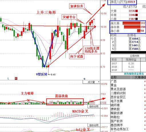 股價從前高下跌20%,在底部形成V型反轉(zhuǎn)。在下跌時先放量小漲再縮量下跌,有主力資金入場吸籌。之后快速回升進行震蕩洗盤,清洗獲利盤和套牢盤,期間低點不斷抬高,成交量逐漸萎縮,形成上升三角形,說明主力高度控盤,大量散戶離場。而且出現(xiàn)長下影T型線,是主力在向下試盤,測試下方支撐強度,為拉升做最后準(zhǔn)備。前期股價放量突破上升三角形平臺,而且受半年線支撐,均線多頭。上周回踩20日均線后反彈,驗證其支撐力度,并且macd和kdj金叉,說明拉升階段正式開始。