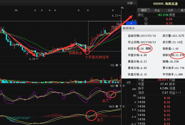 海南高速000886也是本人用三步擒牛戰(zhàn)法選取并在7.19日發(fā)文講解的,大家可看到此股的走勢從前方的高點回落至低點4.26之后主力資金拐頭向上,震蕩上行,隨后回踩走出了十字星反轉(zhuǎn)信號,我就發(fā)現(xiàn)此股的建倉良機,回踩就是機會并且他下方的KDJ,MACD指標呈現(xiàn)了金叉買入的信號,主力資金在加速進場截止目前短短的26個周期的時間也是收獲了31.97%的漲幅。在這里也是恭喜下一直關(guān)注我并成功布局的粉絲朋友,抓住的粉絲朋友也不要太興奮了,后期的操作策略及走勢我會繼續(xù)在朋友圈中發(fā)文講解,大家注意及時的查閱。