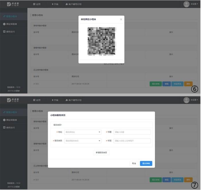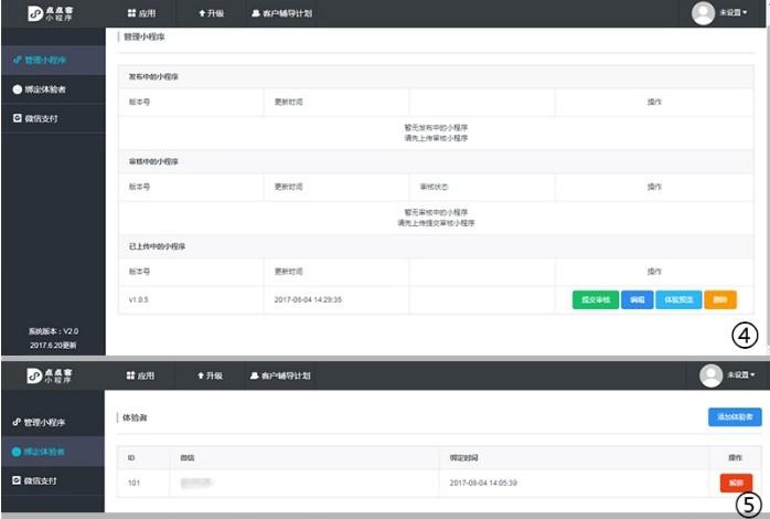 4.上傳的小程序有提交審核、編輯、體驗預覽、刪除四種操作。在提交審核前,最好先查看下預覽效果。只有綁定的體驗者才可以體驗預覽。