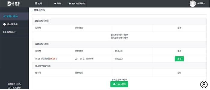 在注冊完微信小程序后,商戶僅需要通過以下的簡單操作,就可以發布自己的專屬小程序。