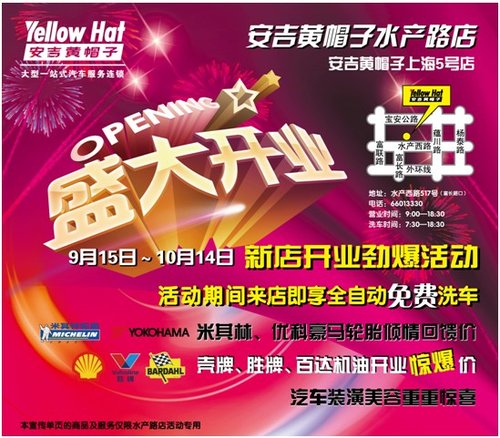 為了配合此次水產(chǎn)路店開業(yè),安吉黃帽子拿出了具有競爭力的開業(yè)活動以展示公司的服務實力。開場大戲是新張一個月內(nèi)(9/15-10/14)全自動洗車機免費洗車,在寶山楊行及顧村地區(qū),這是唯一的一臺全自動電腦洗車設備。由于開業(yè)后正好面臨國家推出了節(jié)假日高速公路免費的措施,國慶出行尤其為車主所關注,本次開業(yè)活動中安吉黃帽子為長途遠行的顧客準備了輪胎、機油、導航和行車記錄儀等一系列產(chǎn)品,而且超低的價格令人心動不已,實實在在地為長途出行的顧客籌謀劃策。讓我們看看:輪胎方面米其林和優(yōu)科豪馬的強勢登場,涵蓋幾乎所有熱門車型的8款輪胎,總有一款適合您,價格也是相當?shù)挠H民。其中,有一款優(yōu)科豪馬的195/60R14的熱門輪胎更是打出了300元每條的驚人價格。另外,鐵將軍行車記錄儀特價又送8G卡,任意一款任我游的導航器都送終身免費升級卡,買任意一款TPMS輪胎檢測儀就送風王打氣泵。每個到店、準備十一出行的車主,安吉黃帽子均為愛車安排免費的長途出行檢測,以解除車主的后顧之憂?梢哉f,十月的長途旅行在安吉黃帽子就可以一站式地解決所有購物需求,而且實惠又放心,也從商品服務方面展示了安吉黃帽子的實力和水準。