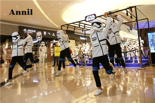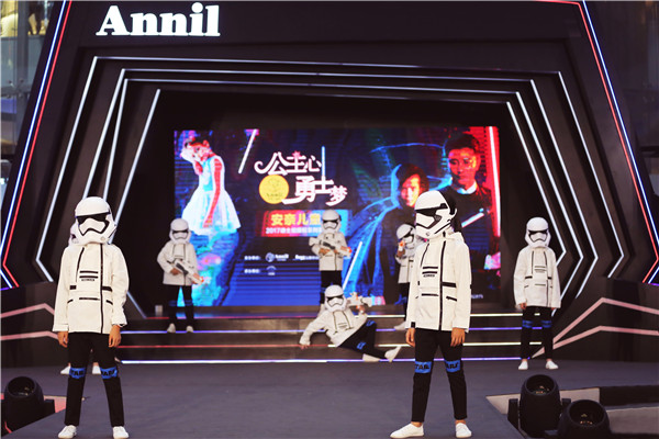 首發(fā)儀式開始之前,安奈兒首先于深圳海雅繽紛城各樓層驚喜帶來“星戰(zhàn)”主題童趣快閃。來自深圳小天鵝模特舞蹈藝術(shù)團(tuán)的小模特們突然從四面八方聚集起來, 身披盔甲化身“小武士”,上演了動感酷炫的星戰(zhàn)機(jī)械舞。