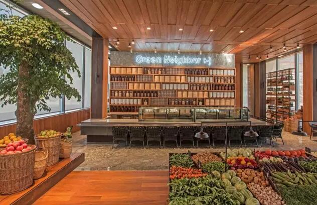 穿過(guò)藝術(shù)庭院與草坪,我們來(lái)到稻草人食堂,有機(jī)蔬菜、水果安分地被排列在一起,隨時(shí)等待精心挑選。