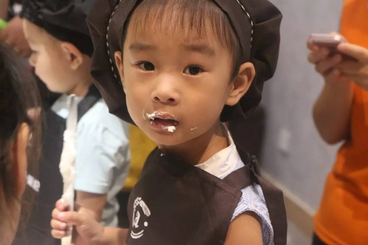 不過小朋友們似乎覺得一邊做蛋糕,一邊吃似乎更加有樂趣呢~哈哈,看看一個(gè)個(gè)都變成了小花貓了呢