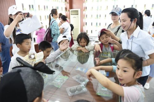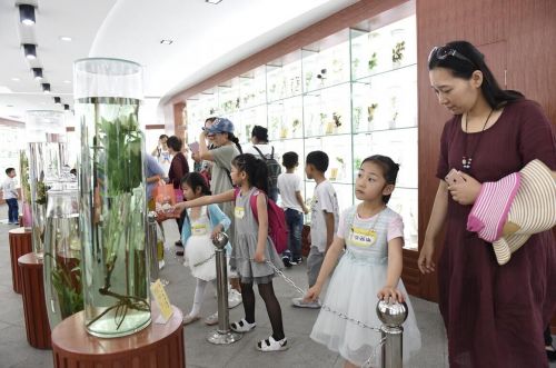 活動第一站是仲景宛西制藥的中藥材標(biāo)本展覽區(qū),上千株不同藥用部位的花花草草、根莖果實在透明的標(biāo)本瓶內(nèi),像是對小朋友們說“歡迎你們的到來”。孩子們天生有對事物探索的本能,仔細(xì)的盯著藥草標(biāo)本瓶看著,“老師,這是什么,那又是什么?”,詢問的聲音此起彼伏。有個孩子覺得草藥長的像大樹,有的又像花朵,甚至還有的結(jié)出的果實像葡萄,孩子們的想像力也是極為豐富的。講解員耐心的為小朋友們講中藥材的特征,產(chǎn)地以及可以治療哪些疾病,孩子們表現(xiàn)出了極大的好奇和興趣,家長們也都聽的很認(rèn)真。