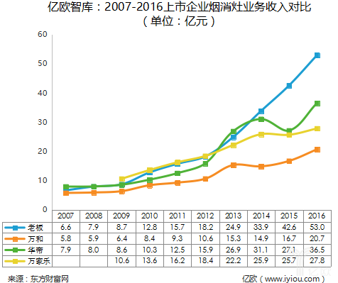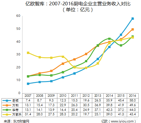 在廚衛(wèi)電器兩大分支中,熱水器行業(yè)品牌集中度相對較高,根據(jù)中怡康市場數(shù)據(jù)顯示,萬和電氣零售量份額16.71%,已經(jīng)連續(xù)十三年行業(yè)排名第一,然而在廚房電器領(lǐng)域萬和電氣要稍稍落后一些,中裝協(xié)近日發(fā)布的《2016年中國建材家居產(chǎn)業(yè)發(fā)展報(bào)告》顯示:(吸油煙機(jī)、消毒柜、燃?xì)庠罹撸┤笃奉愂袌鲆?guī)模已達(dá)近千億市場,廚房電器整體市場規(guī)模為1182.70億元,萬和電氣2016年廚房電器總營收20.68億元,市場占比不到2%,相反老板電器2016年煙消灶總營收達(dá)到了52.95億元,通過下圖可以發(fā)現(xiàn),2007年萬和在煙消灶銷售額上和老板、華帝差距不算太大,只是老板和華帝相對而言更加聚焦廚電產(chǎn)品,在此萬和電氣也甚至煙消灶的市場潛力,2016年報(bào)中披露萬和電氣將加強(qiáng)廚電領(lǐng)域產(chǎn)品的研發(fā)、生產(chǎn)、銷售。