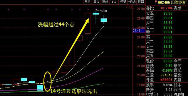 而這種上升回檔走勢的股票其實是有非常多的,就像本人在14號通過選股法選出的四維圖新(002405)也是一只典型的上升回檔走勢的股票:
