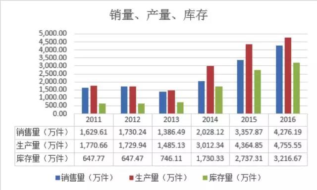 從上圖看,2011到2013這三年,銷(xiāo)量和產(chǎn)量的差距并不大,庫(kù)存比較穩(wěn)定,但2014、2015年產(chǎn)量比銷(xiāo)量猛增一大截,導(dǎo)致庫(kù)存立馬上升,2016年雖然銷(xiāo)量和產(chǎn)量差距縮小,但庫(kù)存已經(jīng)壓下。庫(kù)存與門(mén)店數(shù)量減少密切相關(guān),這批加盟店的庫(kù)存在線(xiàn)下,在七匹狼品牌店內(nèi),可以說(shuō)是沒(méi)有出頭之日了。\u00A0