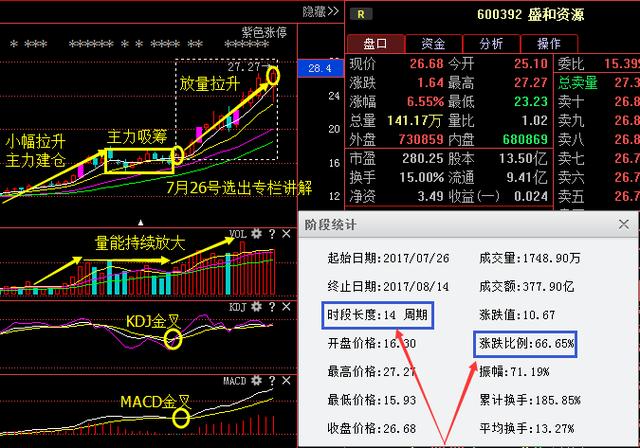 接下來我們再來看下前期盛和資源這只票,該股也是非常符合安安的三步抓妖法的選股思路。和上支票幾乎同樣的走勢,前期股價(jià)小幅拉升主力建倉,隨后股價(jià)一波箱體震蕩主力吸籌,在7月26號(hào)MACD和KDJ同時(shí)形成金叉買入信號(hào),安安果斷給大家選出發(fā)文講解,講解完之后量能持續(xù)放大,股價(jià)隨之拉升上漲,14個(gè)交易日漲幅高達(dá)66.65%!當(dāng)然錯(cuò)過的朋友沒有關(guān)系添加安安薇釁呺:ghaa58或qq:932058005