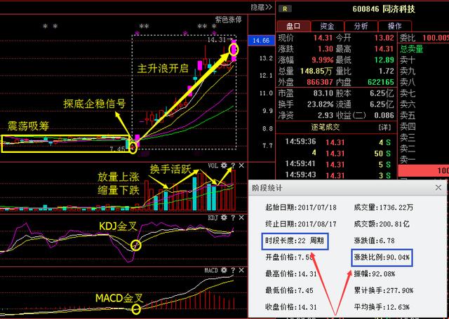 首先我們先來看安安前面一直說的的同濟(jì)科技600846,該股是安安在7月18號(hào)根據(jù)三步抓妖戰(zhàn)法選出且給朋友們發(fā)文講解的,大家可以看到該股前期一直處于一個(gè)震蕩吸籌的狀態(tài),隨后在7月18號(hào)當(dāng)天股價(jià)形成一根下影探底企穩(wěn)信號(hào),于是安安果斷給大家選出講解,講解完之后主升浪開啟,其中放量上漲縮量下跌換手活躍可見其股的熱門性。實(shí)屬難得的一大牛股,自安安講解完之后短短22個(gè)周期漲幅高達(dá)90個(gè)點(diǎn)!在這也是恭喜學(xué)會(huì)了安安三步抓妖戰(zhàn)法且把握到了這波收益的朋友