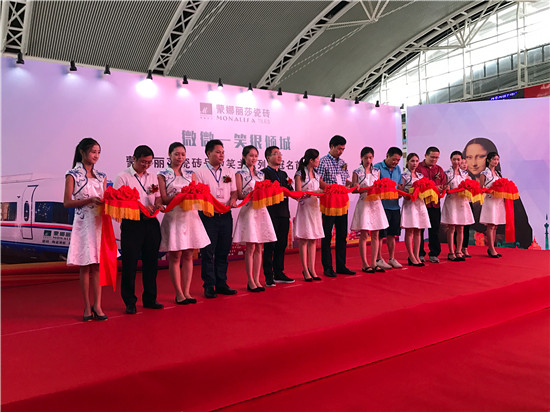 隨后三方領(lǐng)導(dǎo)共同剪開紅綢,開啟蒙娜麗莎和諧號,預(yù)示著蒙娜麗莎瓷磚號微笑主題專列正式啟航。首發(fā)儀式后,一眾嘉賓和媒體朋友們一同登上蒙娜麗莎號動車專列,將“微笑”與“高鐵”元素結(jié)合,感受這趟七夕開往幸福的“微笑”專列。