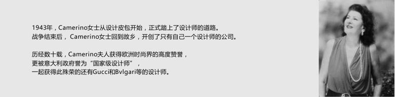 從一個皮包設(shè)計師開始,到成為擁有自己品牌的Camerino女士,在品牌名稱上冠以自己家族Camerino 姓氏,代表著“從一個意外的開始,到擁有一個事業(yè)”,讓品牌名稱更為傳奇性與完整性。
