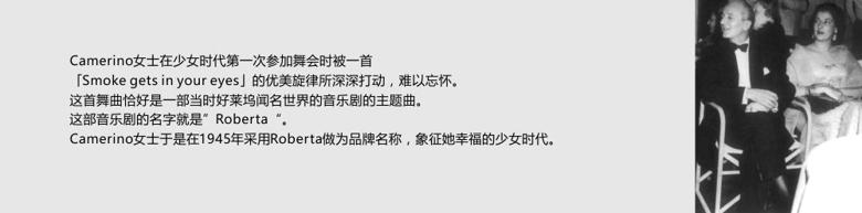 Camerino女士在少女時代第一次參加舞會時被一首“Smoke gets in your eyes ” 的優(yōu)美旋律所深深打動,難以忘懷。這首舞曲恰好是一部當(dāng)時好萊塢聞名世界的音樂劇的主題曲。這部音樂劇的名字就是“Roberta”。Camerino女士于是在1945年采用Roberta做為品牌名稱,象征她幸福的少女時代。