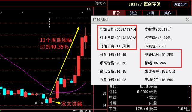 我們在來看看第二只:德創環保,德創環保是本人在14日通過選股方案選出,選出后接著就是持續的上漲,截止目前漲幅達到了40.35%,如果,你在14日有看到本人的我朋友圈,學會了這套選股發案,那么這40%個點的盈利是不是能把握在手了?至于元隆雅圖、德創環保的后期具體操作策略,我會在我朋友圈中持續發文講解,歡迎新老朋友隨時查閱.