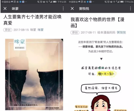 超級(jí)號(hào)咪蒙創(chuàng)作的《人生要集齊七個(gè)渣男才能召喚真愛》與粥悅悅的創(chuàng)作漫畫《我喜歡這個(gè)物質(zhì)的世界》快速突破10萬+,成功激起受眾對(duì)極繁與極簡(jiǎn)的評(píng)論。