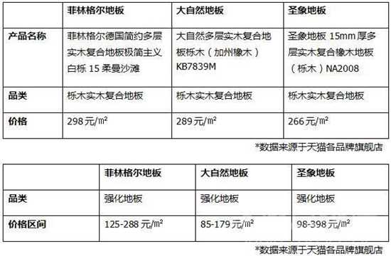 我們把不同品牌的櫟木實木復(fù)合地板價格做對比,可以看出菲林格爾的櫟木實木復(fù)合地板售價298元/㎡,比大自然地板和圣象地板的同品類產(chǎn)品略貴一點。而三個品牌的強化地板價格都在85-398元/㎡區(qū)間內(nèi),主要集中在130元/㎡左右,價格相差并不大。