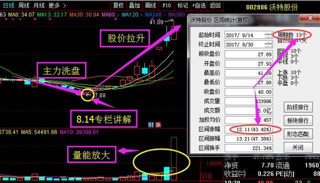 我們首先來看沃特股份(002886)這只次新大妖股,該股本人在8月14日根據(jù)三步抓妖戰(zhàn)法及時(shí)選出,截止目前13個(gè)交易日的時(shí)間漲幅更是高達(dá)近43%。也是恭喜抓到了沃特股份這只股票獲利的粉絲朋友。那么試想一下,如果你也是專欄中的粉絲朋友,有幸看到了我微信號(gpam888)QQ:1578217367的講解,及時(shí)布局介入了沃特股份這只股票,那么這43個(gè)點(diǎn)的漲幅收益是不是同樣可以收獲?