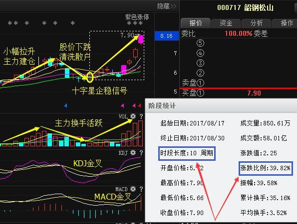 我們再來看第二只000717韶鋼松山,該股屬于當(dāng)前熱門題材鋼鐵行業(yè),大家可以看到該股前期股價(jià)小幅拉升主力乘機(jī)建倉,隨后股價(jià)開始下跌清洗散戶,隨后在8月17號當(dāng)天股價(jià)形成十字星企穩(wěn)信號,本人看到之后也是果斷給大家在專欄發(fā)文講解,講解完之后量能逐漸放大主力換手活躍股價(jià)開啟上漲,截止到目前短短十個(gè)周期漲幅40個(gè)點(diǎn),MACD和KDJ都出現(xiàn)金叉,該股后期走勢本人依舊看好,也會在專欄持續(xù)跟蹤,大家注意及時(shí)查閱!