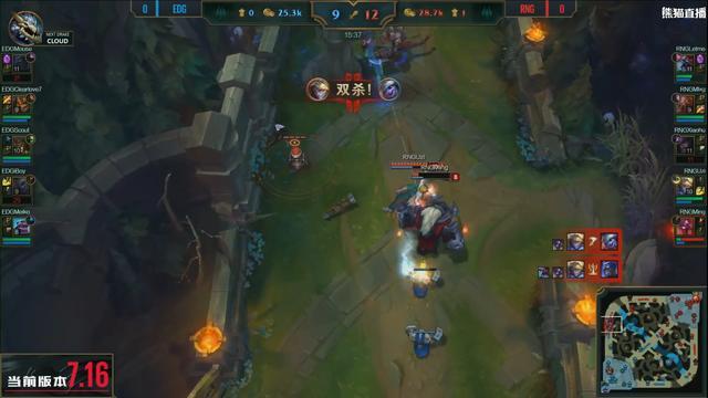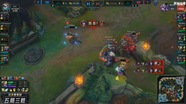 然而RNG戰隊很快調整過來了,在Letme的節奏帶動下,抓死EDG中路和下路組合,穩住了局勢。在15分鐘,雙方在上路爆炸混戰,EDG夾擊RNG上路三人,但是被酒桶大招反秀了一波,RNG在Uzi趕到之后,殺意已決,牛頭大招抗塔,Uzi終結慎拿下雙殺!