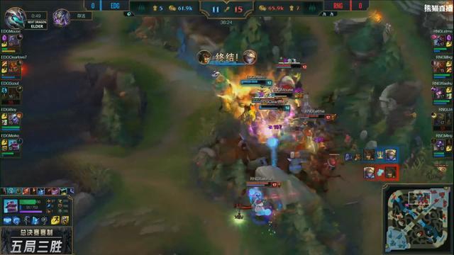 最后一波團戰雙方在遠古龍處打響,香鍋酒桶肉身開團,但是此時EDG的經濟落后實在太大了,RNG雙C在后面爆炸輸出,小虎拿下雙殺,RNG打出一波0換4,Iboy成功逃跑了,彈幕狂刷EDG永不團滅。最終RNG一波推掉基地豪取開門紅