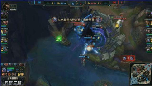 這局雖然是賽點局,但是EDG完全不慫,雙方線上的打的都很兇,有來有回。游戲來到20分鐘的時候,妖姬來到上路配合大蟲子交出兩個閃現頂高地塔強殺凱南后,RNG三人支援過來擊殺大蟲子的同時,EDG三人抓住機會直接開大龍,盧錫安大招干擾,小炮收掉大龍后,皇子也被趕來的RNG眾人擊殺,EDG其他三人安全撤離。27分鐘的時候,人頭比6:7,經濟EDG領先4000。30分鐘,EDG三人收掉土龍。