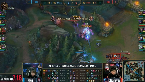 作為EDG讓二組追三的最后一場,Clearlove7和大部分人預期的一樣,總會帶來一些不一樣的東西,豬妹在開局打完紅BUFF之后就完美繞開視野對下路進行一波GANK,導致RNG下路AD送出一血。三四分鐘的相安無事之后,皇子配合酒桶在上路擊殺蘭博,但此時廠長的豬妹在中路配合盧錫安越塔完成了對發條的擊殺。這一把RNG選出了偏向發育性的中單,EDG明顯開始針對發條,兩分鐘后發條再次慘死塔下。好在這兩次死亡對RNG并沒有造成太大影響。隨后的20分鐘雙方在小規模團戰上都沒有占到太多便宜,直到比賽進行到第29分鐘的時,UZI中路頭鐵猛點寒冰,然后被反手秒殺,EDG通過一波0換3拿到第五場比賽的第一條大龍。通過大龍所帶來的優勢成功破掉RNG三路高地,最后42分鐘左右,Meiko牛頭在敵方高地一波閃現開團,直接斷送了RNG夏季賽的冠軍夢,成功完成EDG隊史首次的讓二追三。