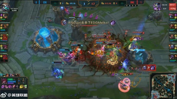 可能是由于觀眾超高熱情,雙方在首場打得相當激進,開局兩分鐘Clearlove7游走上路成功拿下Letme一血并打出閃現,在隨后的6分鐘里尚未爆發戰斗,麻辣香鍋的幾波游走下路都被Meiko敏銳的嗅覺成功發現。8分鐘左右麻辣香鍋的酒桶在敵人野區巧遇廠長皇子,慎大招支援完成對酒桶的擊殺。1分鐘之后下路爆發混戰,EDG下路一塔被破,隨后廠長率領EDG眾人來到RNG上路越塔,結果被酒桶關鍵大招破壞陣型,EDG頭鐵被RNG打出一波2換5,RNG拿到優勢后在中期穩定優勢,并且很好的去壓榨了EDG野區資源。28分鐘,RNG在攻破EDG上路高地之后順利拿下大龍,在大龍的幫助下,EDG難以抵擋RNG時刻避免戰斗。38分鐘雙方在遠古龍坑展開團戰,RNG以巨大優勢團滅對手,并且在比賽進行到第39分鐘成功推掉EDG的基地水晶,拿下首場勝利