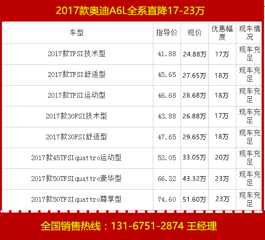 近日,本店內2017款奧迪A6L現車銷售,顏色可選,目前購車部分車型可優惠17-23萬元,感興趣的朋友可以到店咨詢購買,詳情見下表: