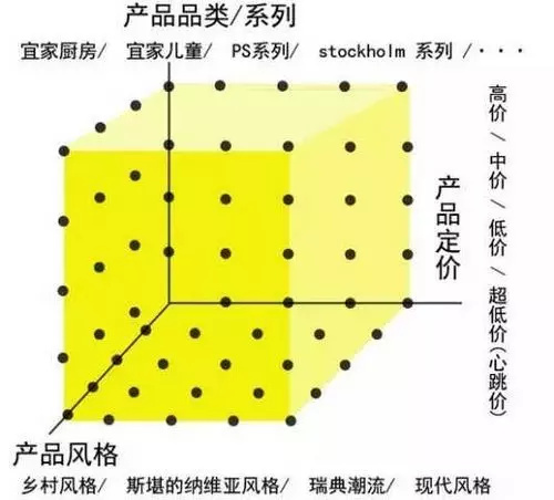 宜家從多個維度來為自己的產品布局,最后形成了4×4×N(N是品類和系列)的超細分,高覆蓋率的產品矩陣。