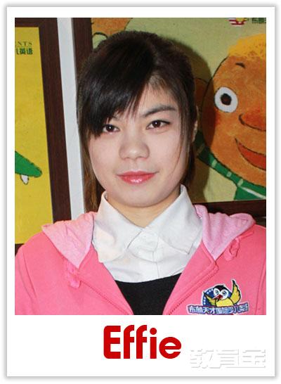 Effie 布朗英語中教主管 Effie老師通過了幼兒英語教學(xué)專業(yè)培訓(xùn)和布朗英語(全球)資深教師崗位培訓(xùn),是布朗英語資深教師。她在課堂上關(guān)注孩子的每個(gè)細(xì)節(jié),從細(xì)微處培養(yǎng)孩子的多元能力。生動(dòng)的上課風(fēng)格讓英語學(xué)習(xí)變得快樂,Effie老師和家長的良好互動(dòng)對(duì)孩子的學(xué)習(xí)和課后鞏固起到了事半功倍的效果。教學(xué)理念:Education is not to change a person,but rather to help aperson.(教育不是要改變一個(gè)人,而是要幫助一個(gè)人。)